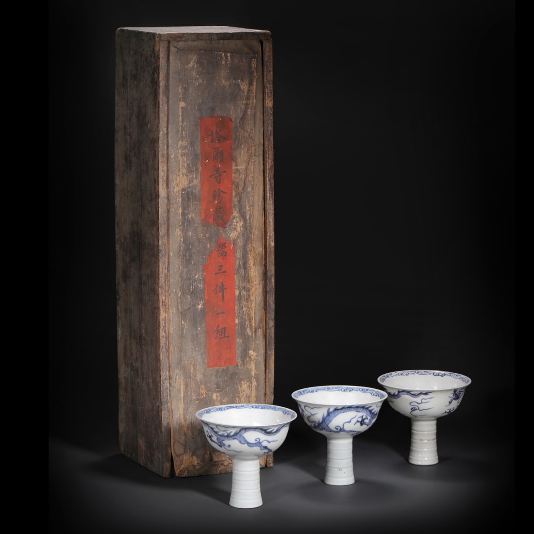 Blue and white dragon pattern goblets, three pieces