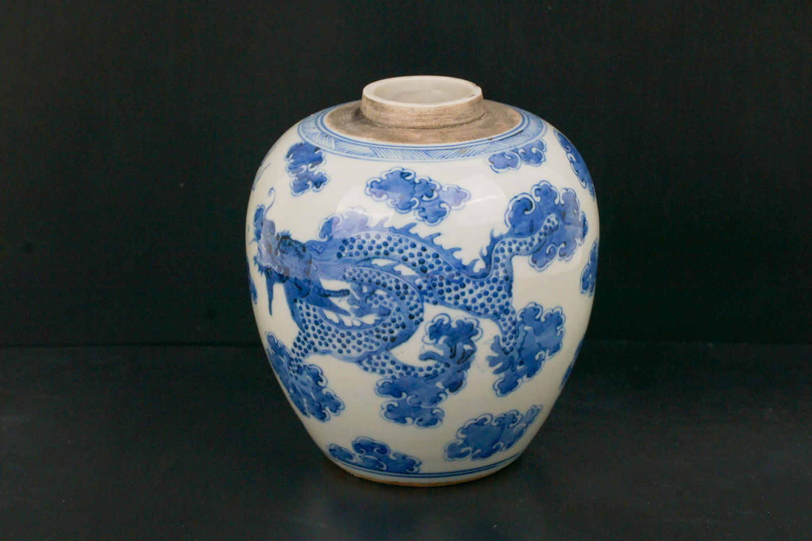 Blue-and-white dragon pattern pot with small opening