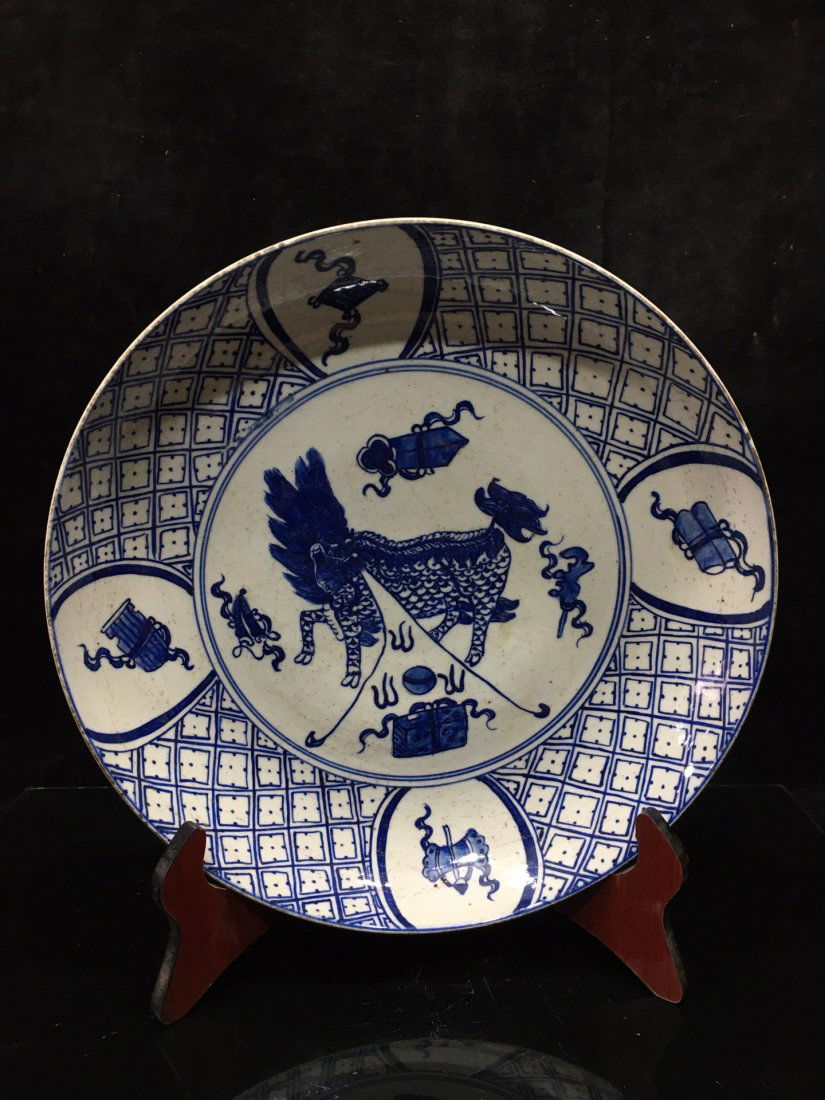 SoldMING BLUE & WHITE PLATEDimensions: Width: 46cm, Height: 7cm Chinese Ming Dynasty Blue and White Porcelain Plate. The plate has a broad wide central interior, rounded mouth lip, thick and large, raised on correspondence footSee Sold Price