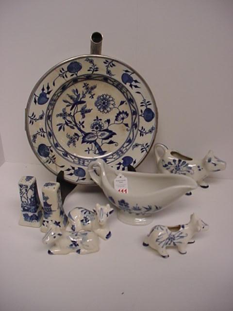Blue and White Warming Dish, Salt, Pepper, Cows