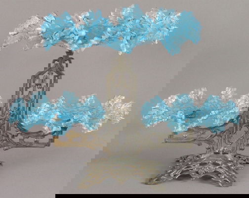 SoldCenterpiece Epergne, Blue Frosted Art Glass Bowls (3) & Center LilyCenterpiece Epergne, Blue Frosted Art Glass Bowls (3) & Center Lily, 26" x 21" x 11.5", All Mounted On Elaborate English Silverplate Stand, Very Nice Quality, Collection Of Gus D. Kokinos, Louisiana.See Sold Price