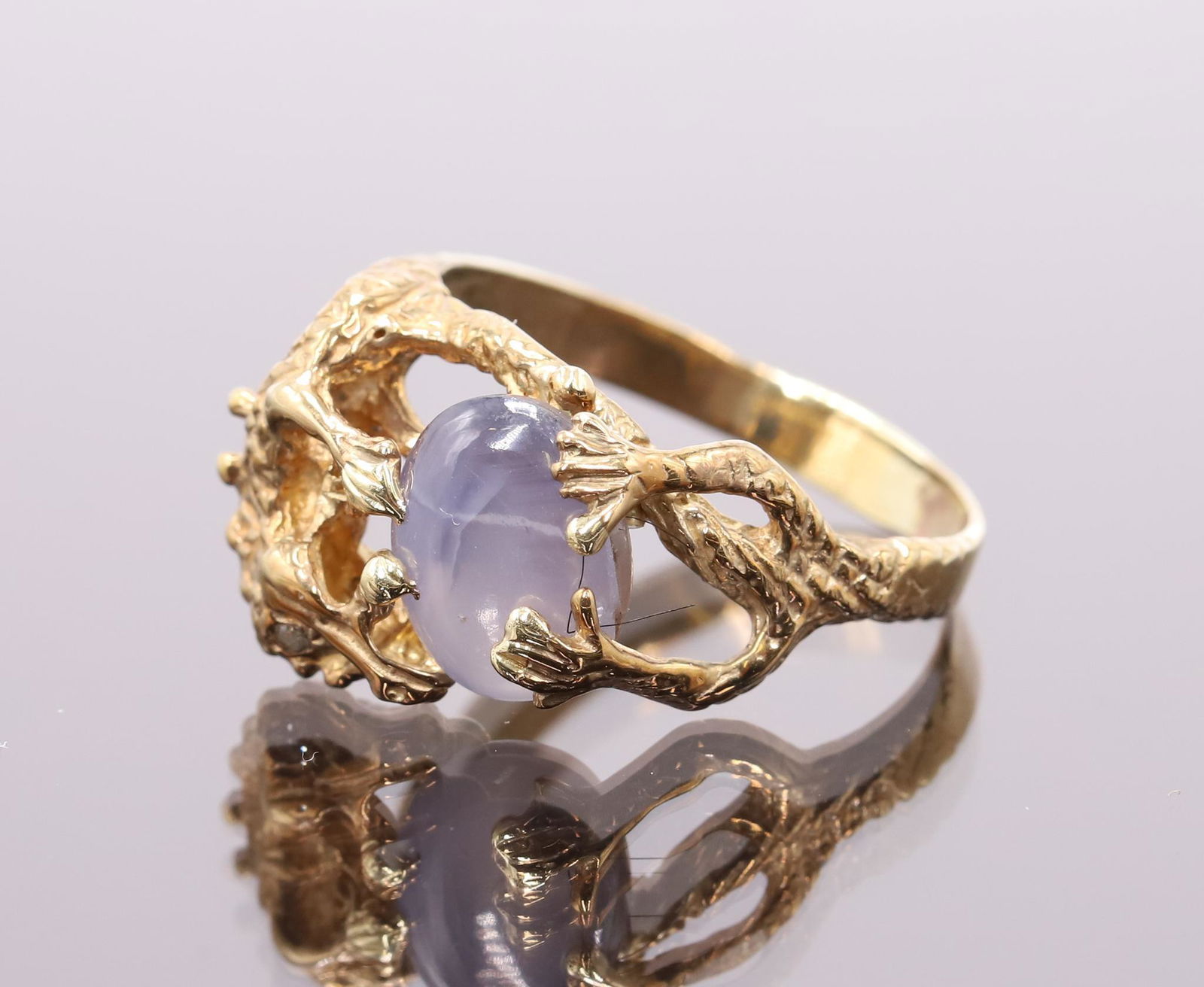 SoldVintage 14K Gold Nugget Style, Star Sapphire RingThis beauty is a 14K gold ring that is textured to resemble a gold nugget. Beautiful, slightly off center, cabochon blue star sapphire.? There is what appears to be a maker mark that is worn and 14K iSee Sold Price