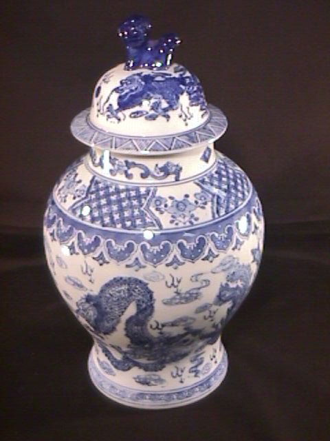 BLUE WHITE ORIENTAL STYLE COVERED GINGER JAR