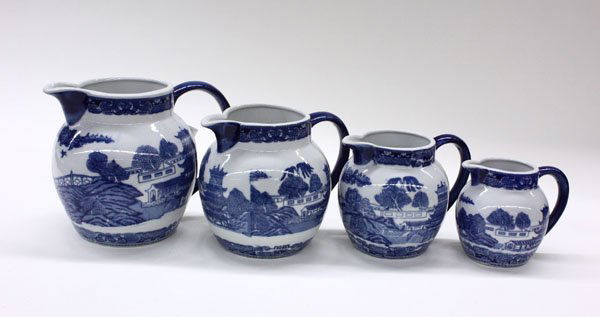 Blue Willow pattern graduated pitchers