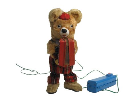 Sold813. Accordion Bear. Japan, Kraemer, 1950s. Battery813. Accordion Bear. Japan, Kraemer, 1950s. Battery operated toy. Litho tin and fabric. Wonderful graphics on microphone. 11” high. Very good. Working.See Sold Price