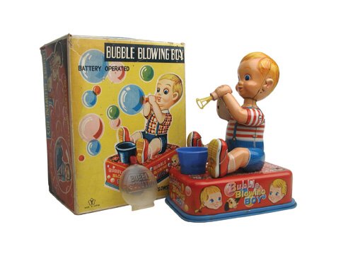 SoldJAPAN Battery Op BUBBLE BLOWING BOY w/ BOXExcellent battery operated toy looks in never played with condition. Worked when tested. Come with instructions, insert, and box. 8" Near MintSee Sold Price