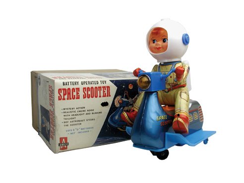 SoldJAPAN Battery Op SPACE SCOOTER w/ BOXNice battery operated Space Scooter made in Japan. All Original and complete. Hinge on battery door is broke. Toy worked when tested. Comes with partial box. 9" Very Good-ExcellentSee Sold Price