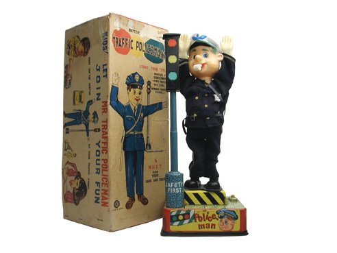 SoldToyo Plaything Mr Traffic Policeman B/O with Box, JapanA1 Japan-marked Policeman with light. Clean battery compartment and outfit. Whistle still present.See Sold Price