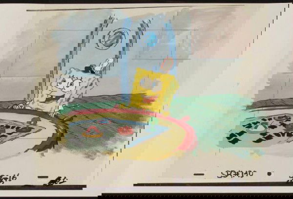 Michelangelo of (TMNT-1987) Turtles- Original Production Cel with Master Hand-Painted Background andAn original Teenage Mutant Ninja Turtle Production Cel with MASTER Hand-Painted Production Background and MWS Seal. This cel depicts a frame from a scene in a Teenage Mutant Ninja Turtles cartoon epis