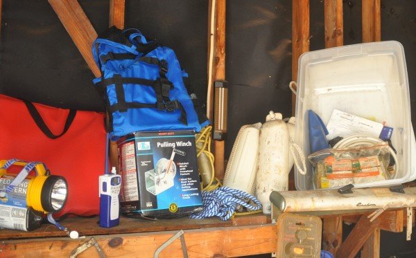 Boating supplies: pulling wench, flotation cushion,