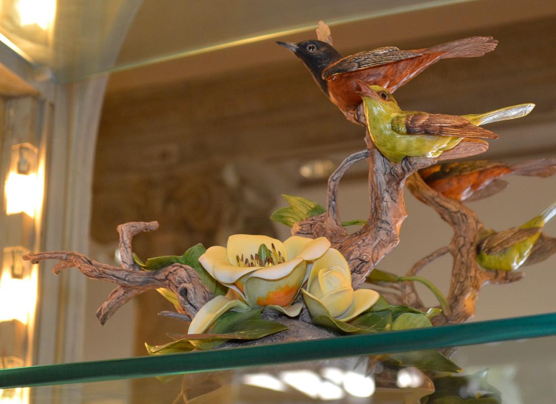 SoldTwo Boehm bisque bird groupsOrchard Oriole, on floral branch, #400-11, 11 in. H. and Crested Flycatcher, on Maple branch, #488, 18 1/2 in. H.See Sold Price