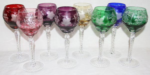 BOHEMIAN MULTI COLOR CUT CRYSTAL WINE GOBLETS