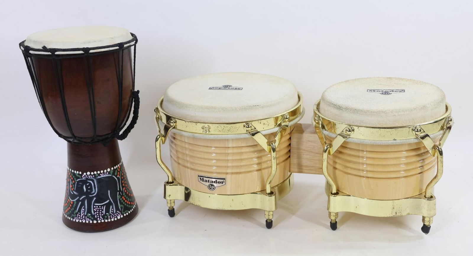 Sold2 Drums incl Djembe DrumAlso includes LP Percussion Bongos. Some paint loss. 9" to 28-1/2" wide X 7-1/4" to 11" high. MEG IMPORTANT: Before bidding, please read the terms and conditions. When you registered for the auction ySee Sold Price