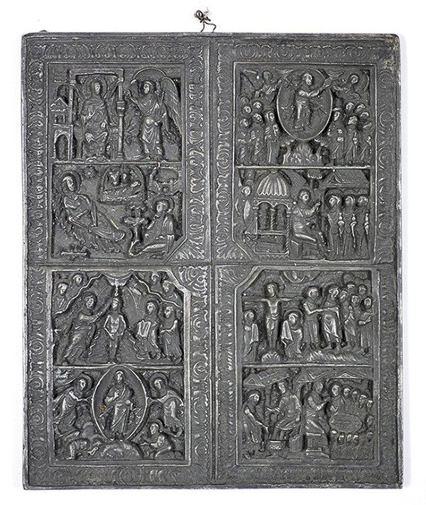 An antique Russian tempera on wood icon with decorated oklad and multi-religious sceneOstantix Auctions4.4(13)€1604 days Left