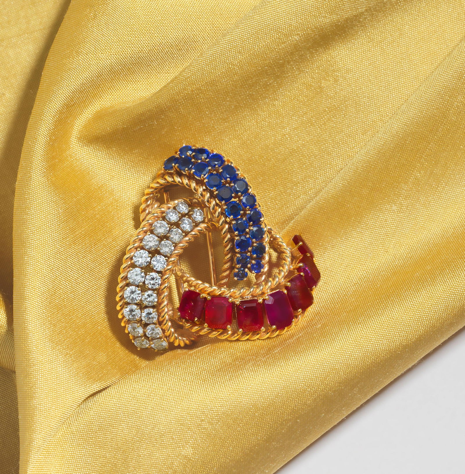 BOUCHERON: DIAMOND, SAPPHIRE AND RUBY BROOCH