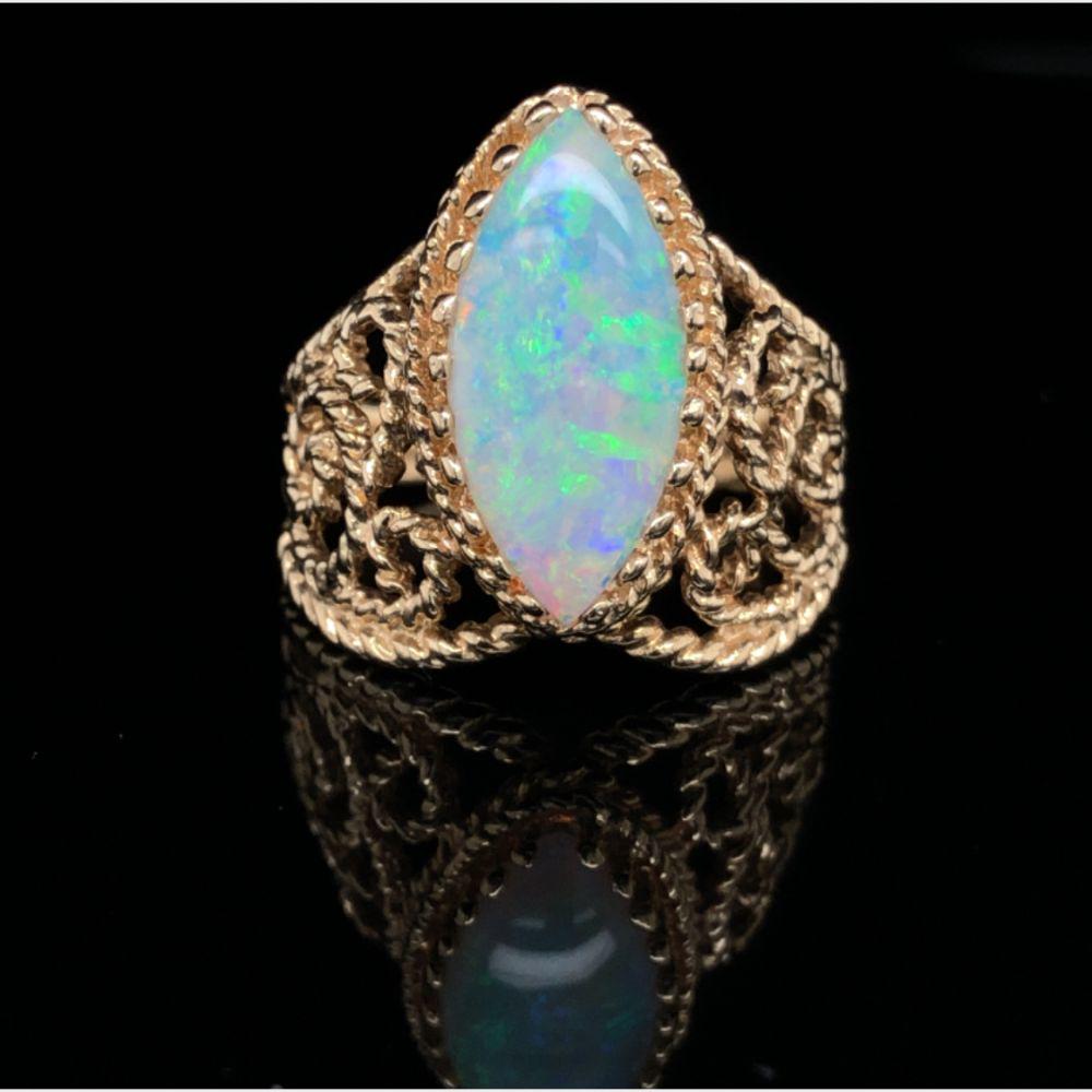 SoldAntique 14k Gold Australian Boulder Opal RingLot 318 Antique 14k Gold Australian Boulder Opal Ring Ring Size: 5, Width: .26 in. Diameter: .89 in. Opal: 5.5 x 2.75 mm 2.32 gSee Sold Price