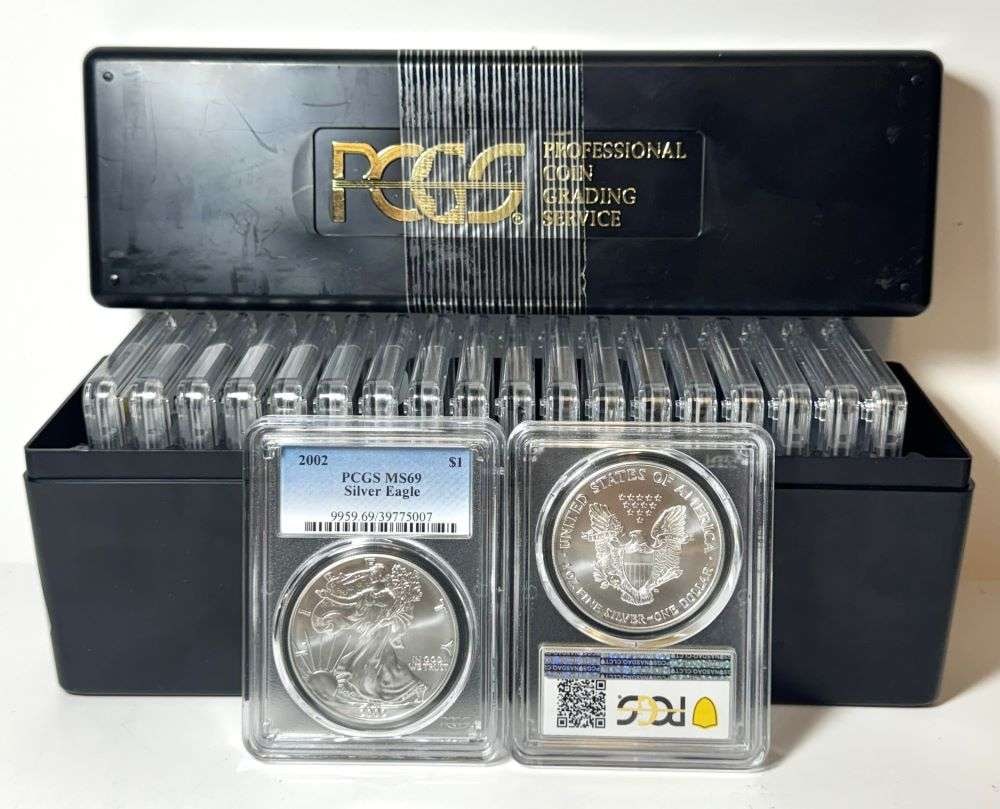 Sold(20-coins) Box 2002 American Silver Eagle PCGS MS69Winner shall receive one box (20-coins) precisely resembling the ones shown here. (RR/PUB)See Sold Price