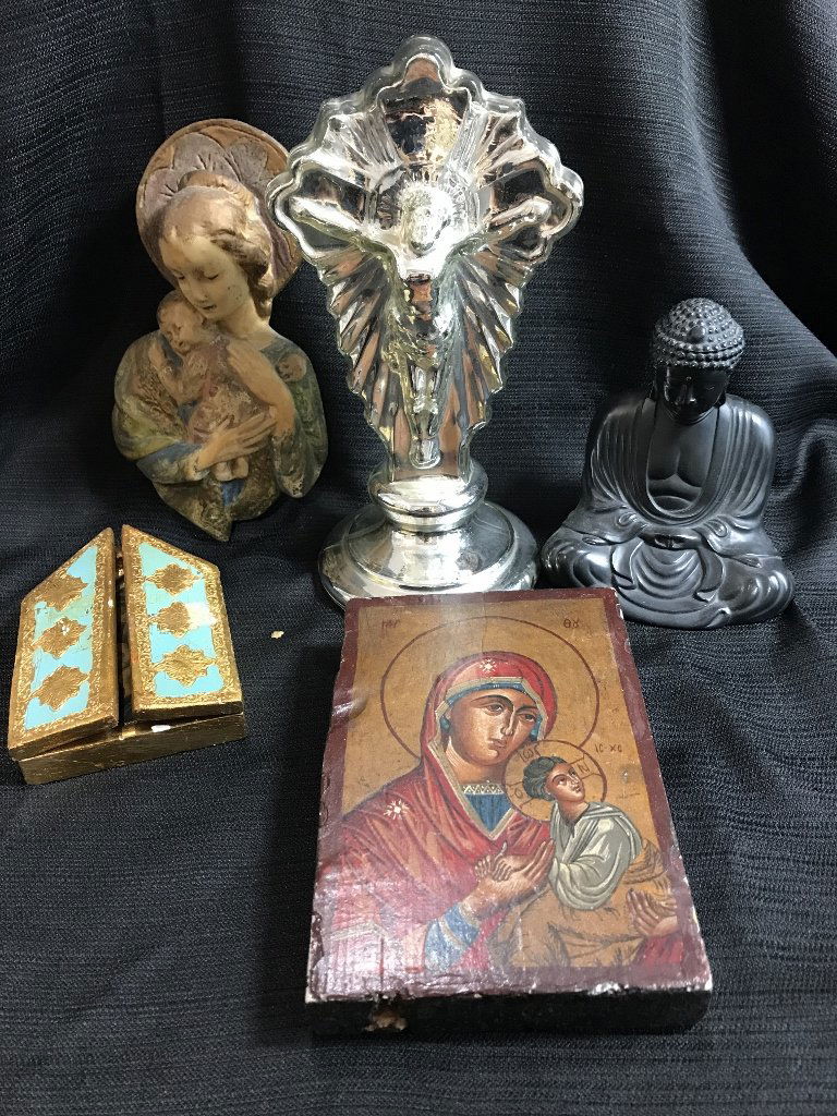 LOT OF ROSARY BOXES, CROSSES, ETC.6 days LeftLot Miscellaneous ItemsMar 07, 2026Judaica Lot of 3 Vintage SculpturesFeb 18, 2026Lot Of 4 Vintage Jewelry Boxes With Various Pieces Of Costume Jewelry / AccessoriesFeb 21, 2026Five Piece Lot of Paintings on PorcelainFeb 21, 2026Lot of Seven Hand Painted Wood & Paper Mache Boxes7 days LeftA composed lot of three tempera on wood Russian icons with silver and silver plated oklad.Feb 24, 2026Religious Sterling Cross Lot2 days LeftBox of Miscellaneous Small Items Estate Fresh1 hr LeftCollection of silver consisting of pepper and salt shakers, jugs, bell, bowl and statue of a boy,6 days LeftMixed Catholic Devotional Objects Collection)Mar 15, 2026AN 18TH/19TH CENTURY NEPALESE TIBETAN BRONZE BUDDHA modelled behind a flaming shrine. 22 cm x 10 cm.16 hrs Left4 French Table ArticlesFeb 25, 2026Rare Chinese Shoushan stone 18 Lohan or Arhats w custom stands - We offer at cost in-house shippingMar 02, 2026Purple copper Guanyin ornamentMar 04, 2026GROUP OF RELIGIOUS ITEMS, INCL. WESTCLOX CROSS-FORM CLOCK.Feb 19, 2026