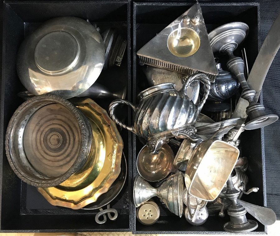 Box lot-Misc silver plate in 2 trays