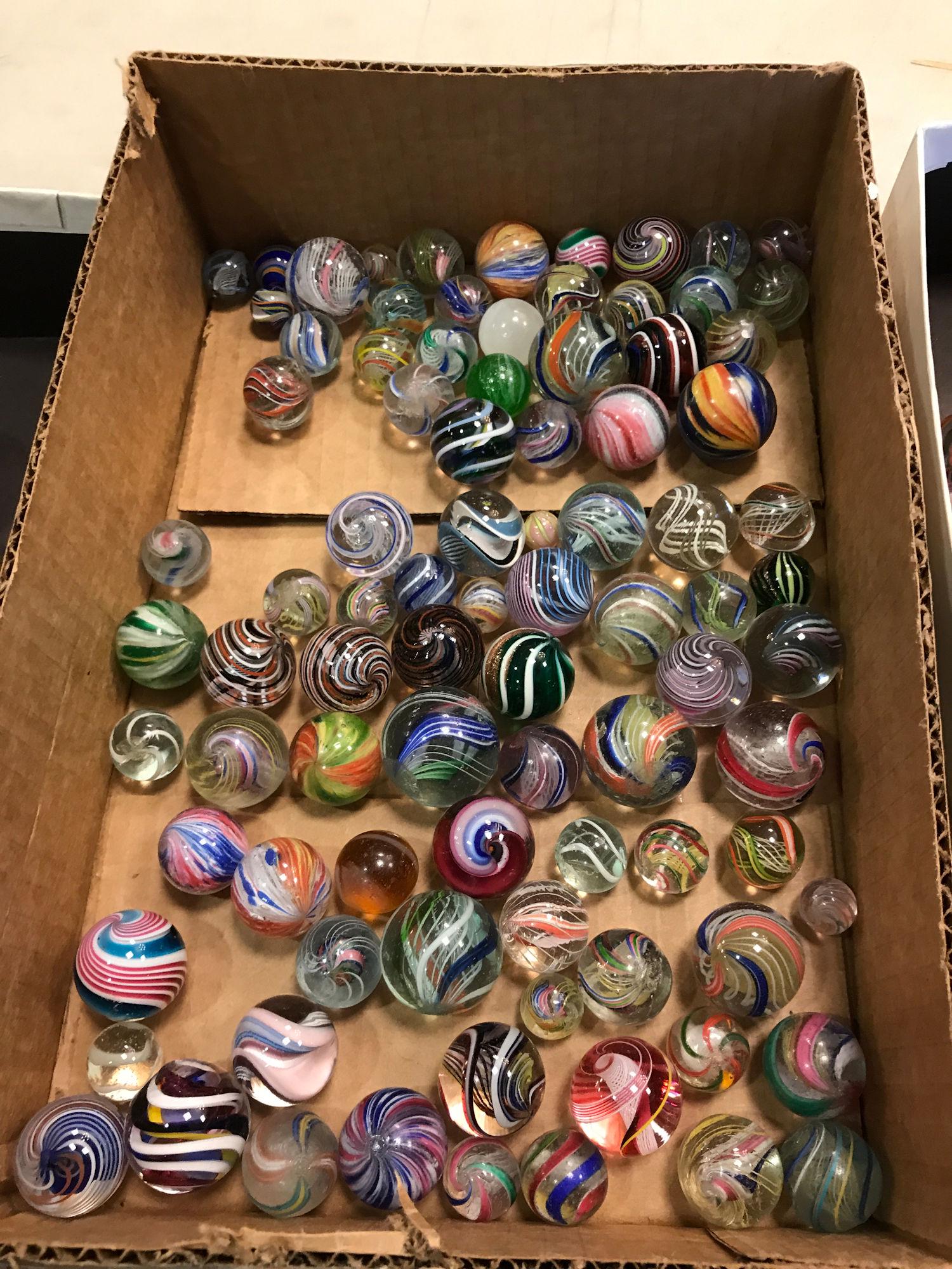 BOX LOT SWIRLED MARBLES, THE LARGEST MEASURING 1".