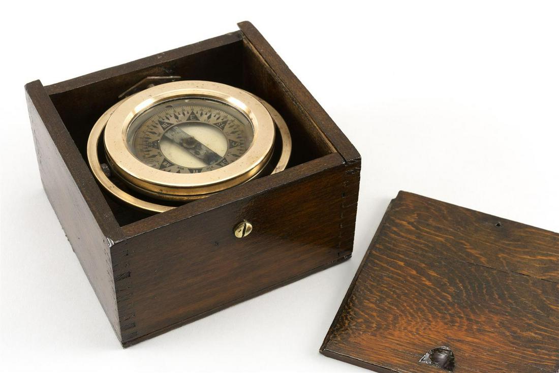 BOXED BRASS COMPASS Mounted with brass gimbal.