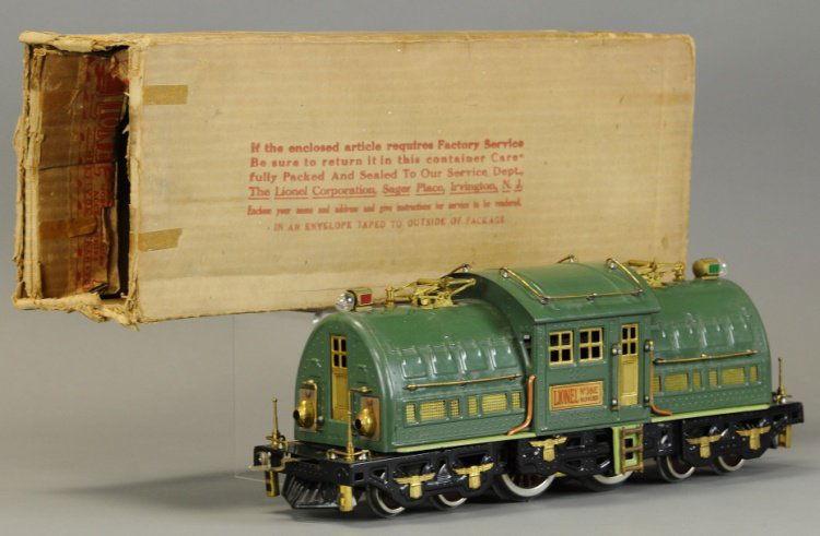SoldClean Boxed Lionel 10E ElectricStandard Gauge. Nice example with pendulum reveres. It shows light to moderate playwear, wheels turn freely with nice box, C7-7+See Sold Price