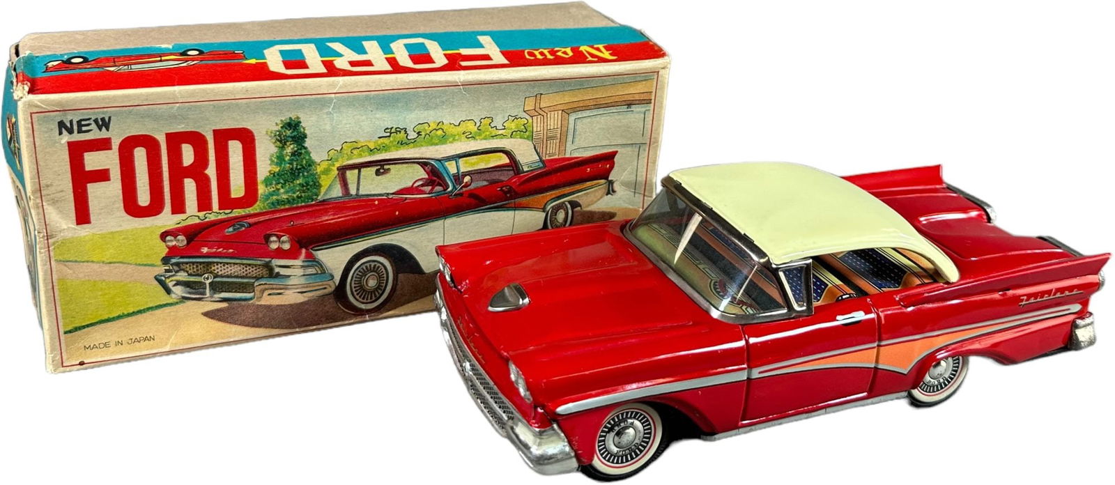 SoldJapanese Ford Fairlane 500 Sunliner Toy.Tin friction. Includes colorful original box with nice depiction of man driving auto. Made by Bandai circa 1955. Some creasing to bottom left corner of box. Minor soiling to lid. Car itself is in desiSee Sold Price