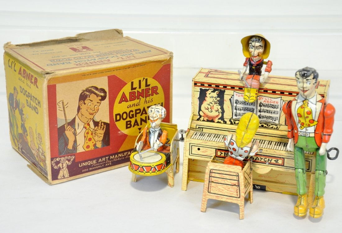 Toy Lot4 days LeftNovelty Bar Chimes NOS, Buddy L Battery Op Toll Booth, Wood Ag Hall Toy SetMar 16, 2026Vintage/Contemporary Charles Schultz Peanuts Collectibles6 days LeftTin Toys & BanksFeb 28, 2026TAIYO Bump 'n go in Box & 4 Other Tin ToysBOXED UNIQUE ART LIL ABNER DOGPATCH BANDFeb 27, 2026UNIQUE ART LIL ABNER DOGPATCH BANDFeb 27, 2026UNIQUE ART TIN LITHO L'IL ABNER DOGPATCH BAND TOY3 days LeftArt Li' L Abner & His Dogpatch Band Toy With BoxMar 07, 2026Lil Abner Tin Litho Wind Up WorksMar 01, 2026Unique Art, Lil Abner BandFeb 28, 2026VINTAGE WIND-UP TIN LITHO AND CELLULOID TOY ASSORTMENT4 days LeftVintage Mechanical Toys and Tin Litho Tank Bank (3)Mar 07, 2026LOUIS MARX & CO. (NEW YORK) FORT APACHE STOCKADE PLAYSET.2 days LeftT.N. Japan "Brave Eagle" Battery Operated Tin Toy in BoxMar 07, 2026BOXED IDEAL PINOCCHIO FLEX DOLLFeb 27, 2026