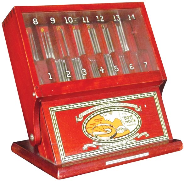 SoldANTIQUE CROCHET HOOK STORE COUNTER DISPLAYCirca 1919 The Boye Needle Company case reads "See for yourself why Boye Hook is best!". It features slots for needles sized 1-14. Appears to have 17 hooks included. It measures 8" tall x 7.5" wide xSee Sold Price
