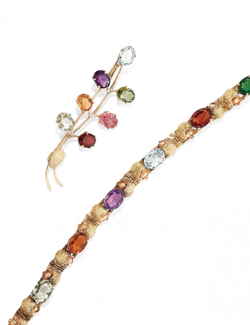 BRACCIALE E SPILLA IN ORO E PIETRE DI COLORE