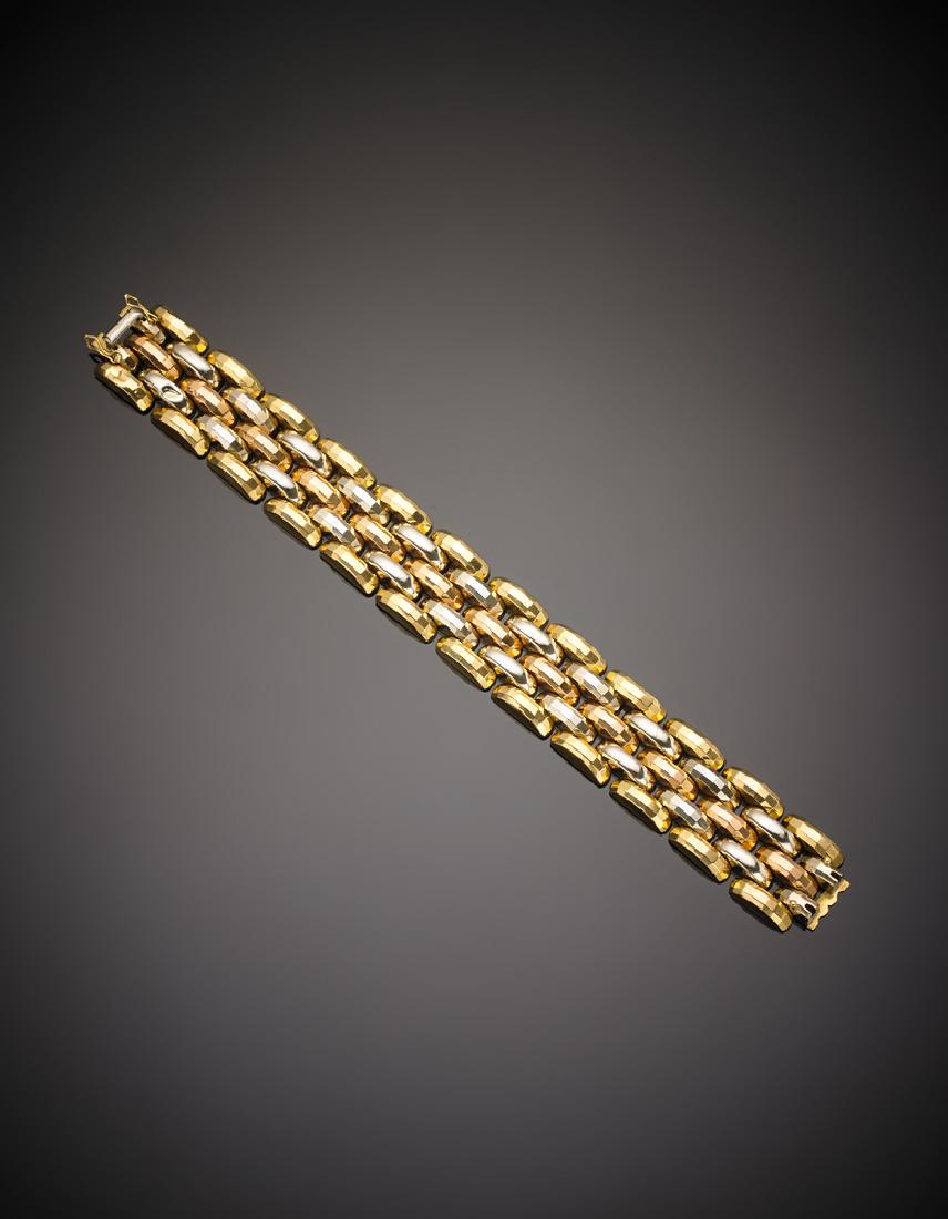 Bracciale modulare in oro giallo, bianco e rosso, con