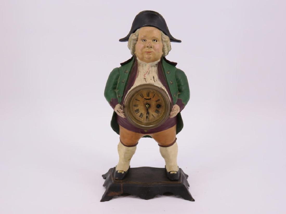 SoldFIGURAL CAST IRON BRADLEY & HUBBARD NOVELTY CLOCKFIGURAL CAST IRON BRADLEY & HUBBARD JOHN BULL NOVELTY CLOCK WITH BLINKING EYES - ENAMEL DIAL - WITH KEY - EMBOSSED ON BOTTOM "BRADLEY & HUBBARD PATENTED JULY 14, 1857" - CLOCK IN GREAT CONDITION STRUCSee Sold Price