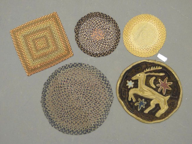 SoldFive Matching Antique Braided Mats.Five Matching Antique Braided Mats. Four are round and one is oval. Largest measures 16-1/2"w. Condition: Good with minor wear.See Sold Price