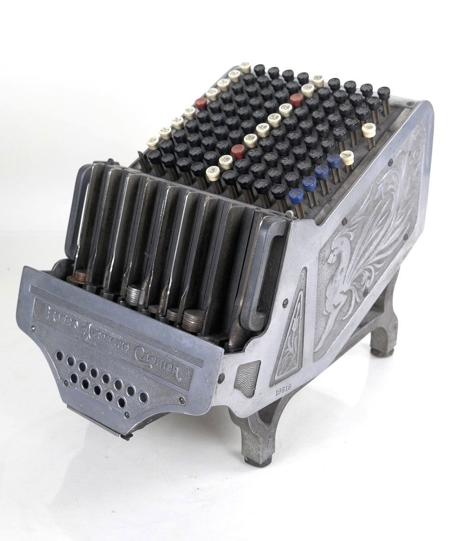 SoldAntique Brandt Automatic Cashier Adding Machine, ChicagoEarly 1900s Brandt Automatic Cashier mechanical adding machine by Brandt Cashier Co., Chicago. Features ornate embossed metal casing with scrolling design and numbered keys in multiple rows. Heavy casSee Sold Price