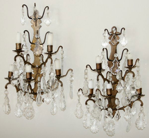 BRASS & CRYSTAL FIVE-LIGHT SCONCES, 19TH C.,