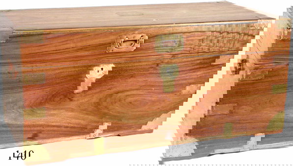 SoldANTIQUE CAMPHOR WOOD CAMPAIGN CHESTBrass bound. Camphor wood. 18 1/2" h x 35 1/2" w x 20 1/2" d.See Sold Price