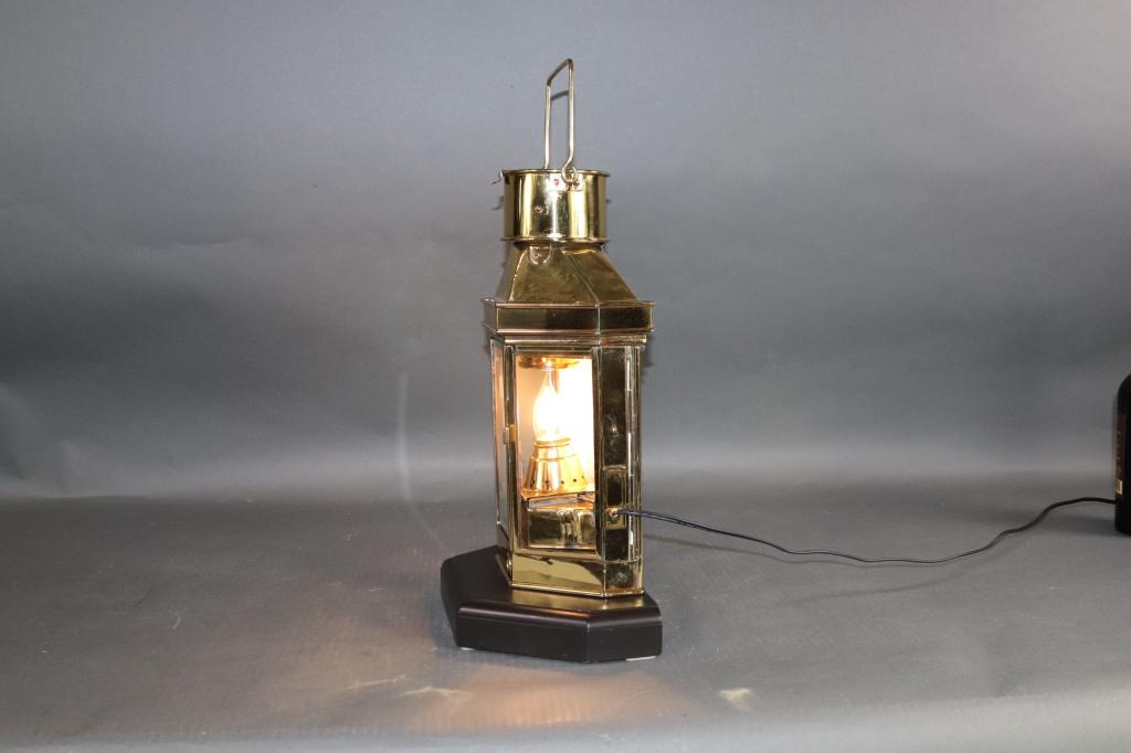 BRASS CABIN LANTERN ON WOOD BASE