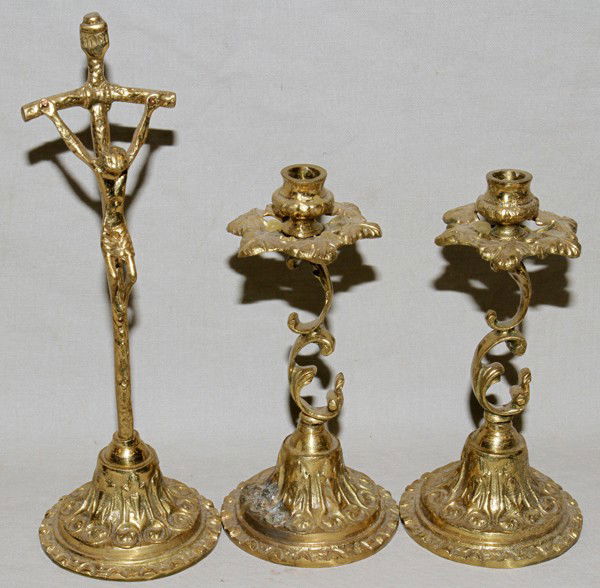 BRASS CANDLESTICK HOLDERS, PAIR, AND CRUCIFIX