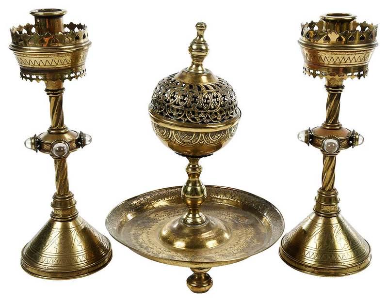 Brass Censer and Pair Gothic Style Candlesticks