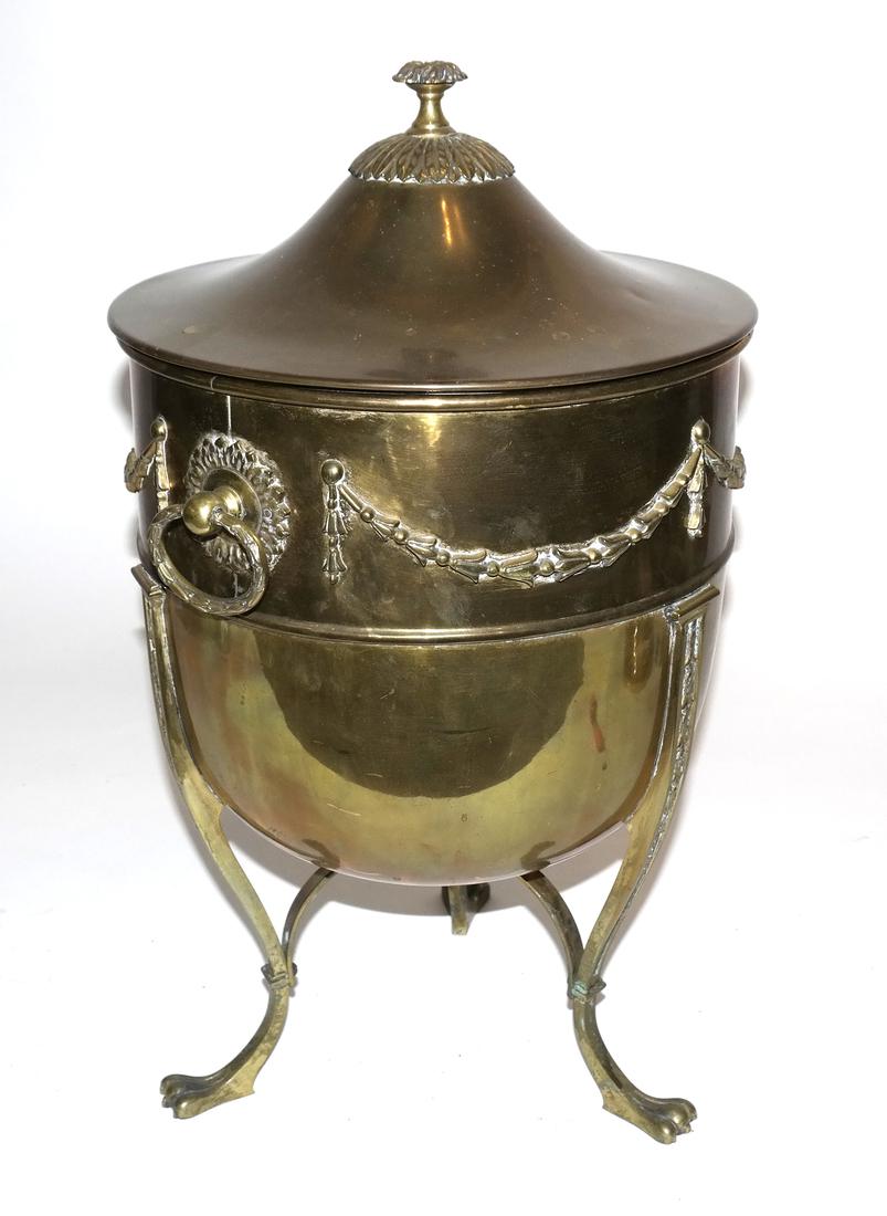 SoldENGLISH EDWARDIAN BRASS COAL BINEnglish Edwardian brass coal bin, early 20th c., domed cover with urn-form finial, basin retaining metal liner, flanked by ring handles at sides, rising on tripodal legs, ending on fanned feet, approxSee Sold Price