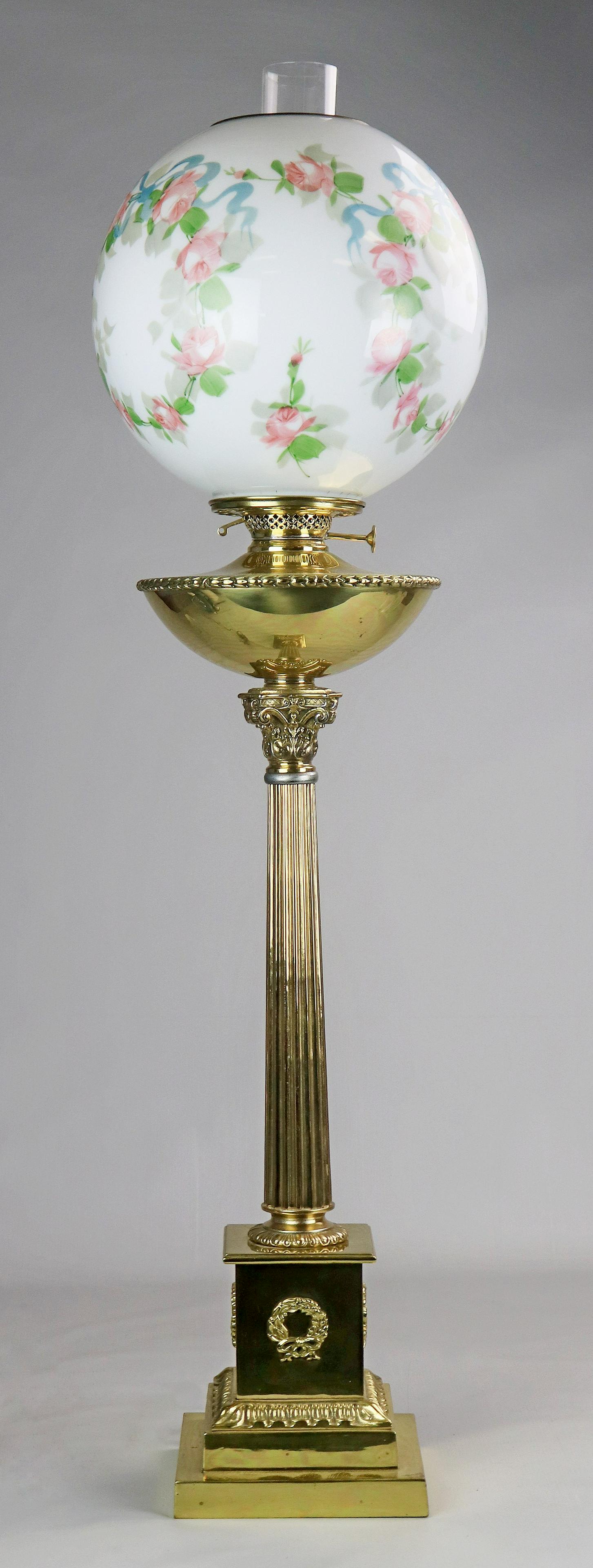 SoldPair of Brass Column Form Oil LampsPair of brass column form oil lamps w/clear glass shades, spring loaded, each approx. 16” T x 4¾” base diameter AND 2 extra matching glass shades, one in original packingSee Sold Price