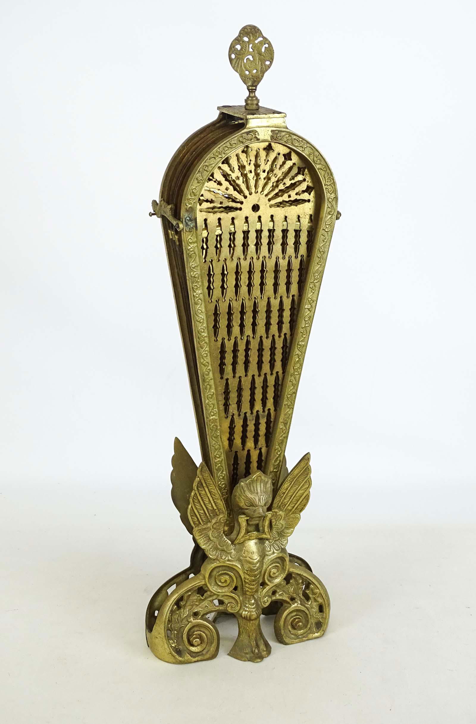 SoldVictorian Style Brass Folding Fan Fireplace ScreenEarly 20th century Victorian style pierced brass folding fan fireplace screen. Approx. height 24 in., base width 8 in., open width 33.5 in.See Sold Price