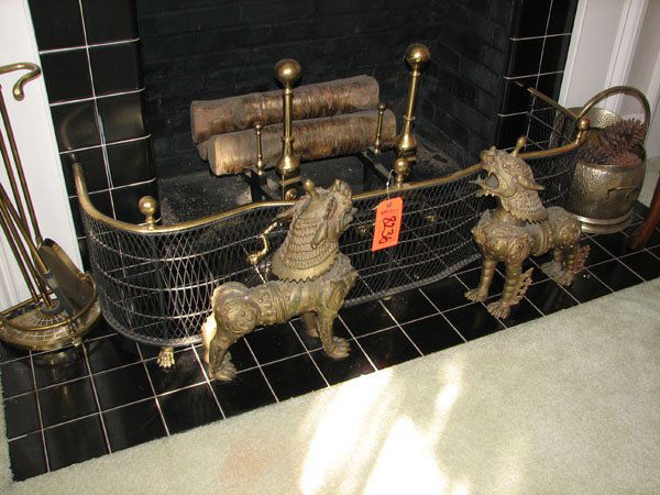 BRASS FIREPLACE SCREEN WITH BRASS LOG HOLDERS AND