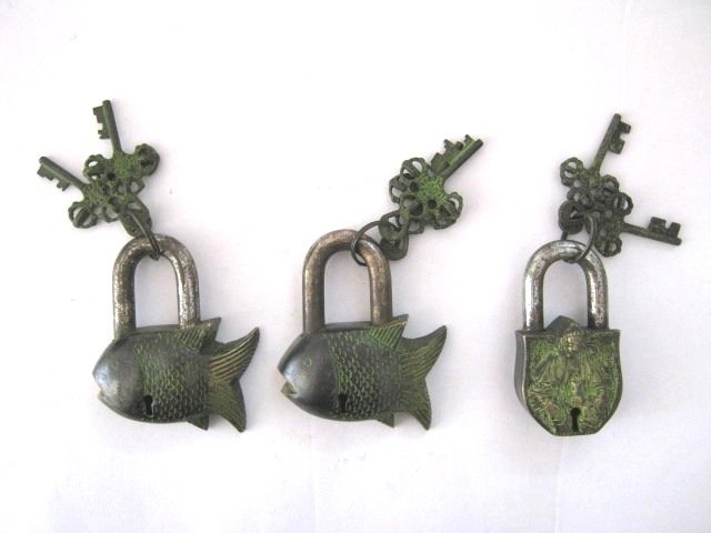 BRASS LOCKS , SET OF THREE . NEPAL