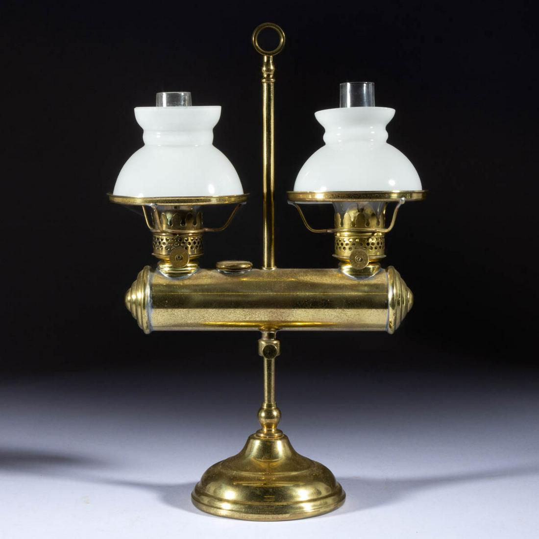SoldUNLISTED BRASS DOUBLE-ARM MINIATURE HANGING STUDENTUNLISTED BRASS DOUBLE-ARM MINIATURE HANGING STUDENT LAMP, central vertical double-arm shaft supporting an adjustable log-form font, original chains and ceiling mount, top fitted with double burners anSee Sold Price
