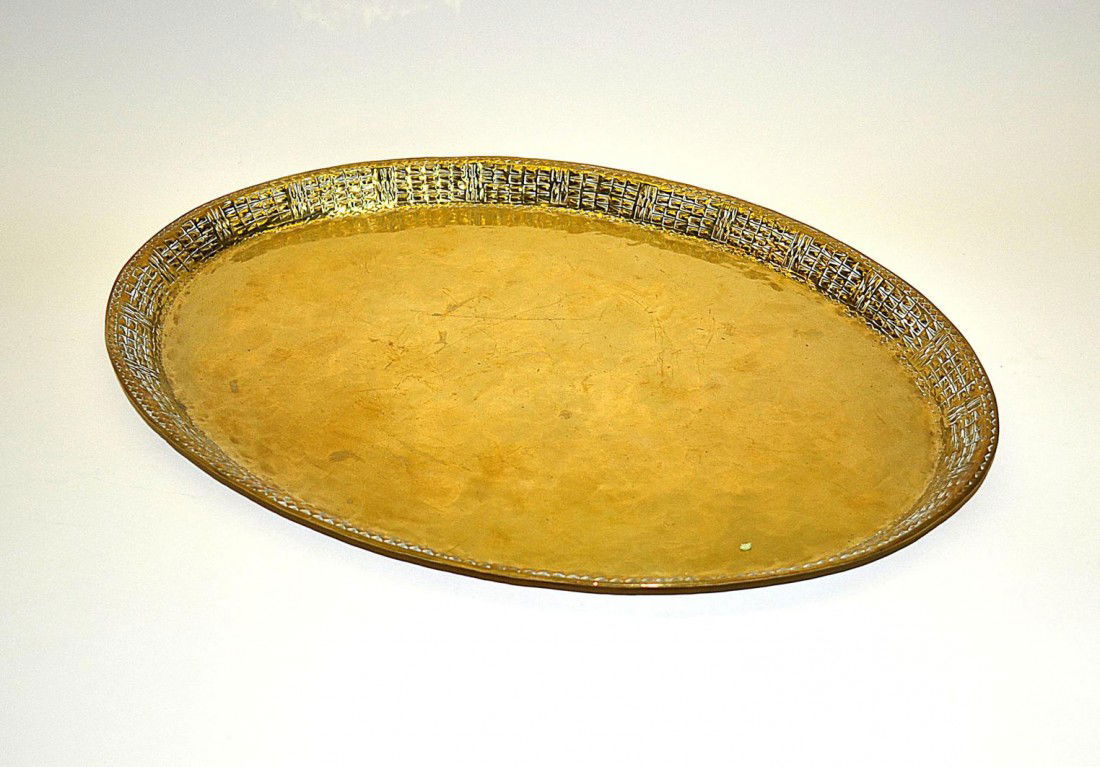 SALVADOR TERAN Brass, Glass Mosaic Tray. Stylized Parrot composed of inlaid colored glass tiles. BraSALVADOR TERAN Brass, Glass Mosaic Tray. Stylized Parrot composed of inlaid colored glass tiles. Brass Leaf form tray with handle. Mexican. Marked Salvador; Hand wrought; Mexico. Dimensions: Height: 1