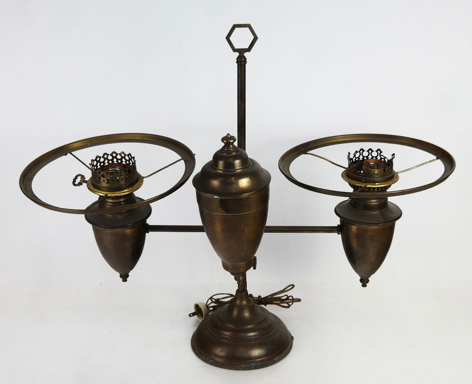 SoldMCM Brass Two Light Table LampMCM Brass two light table lamp with perforated metal shades. Dimensions: 18.5 inches high x 20 inches wide x 6 inches deep Condition : Please feel free to ask for a condition report. Expand photos toSee Sold Price