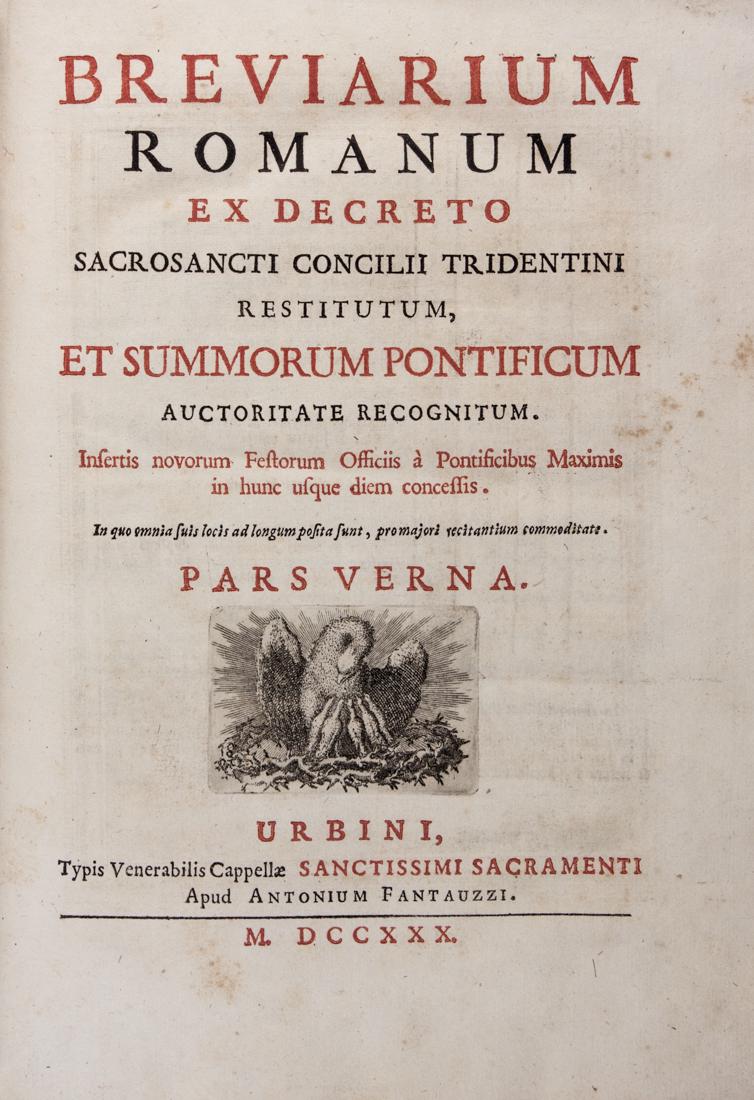 Missale Romanum ex sacrosanct decree Concilii Tridentini restitutum et Pii 5 pont. max. iussu editumVenice, Belleonian Typography, 1786. In 8 . Frontispiece in red and black with intaglio vignette, text on two columns with numerous musical notations, page markers in red fabric, light blooms, elegant