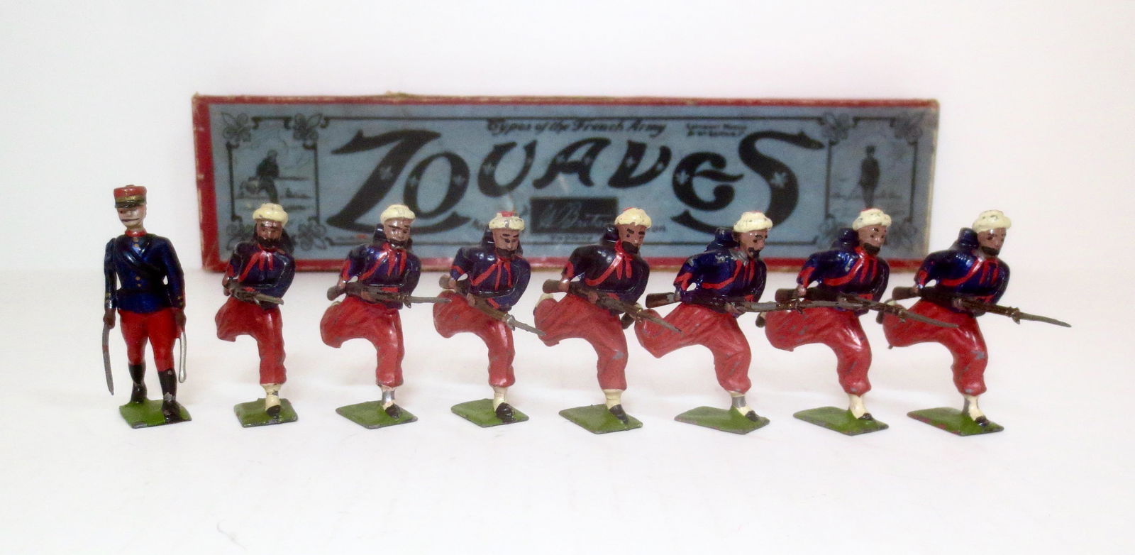 SoldBritains #142 ZouavesCharging with rare officer, first version, oval bases, in original printers decorated box (1905). Fair-good, all except one bayonets missing, the remaining one badly bent, officer good, Box fair-good,See Sold Price