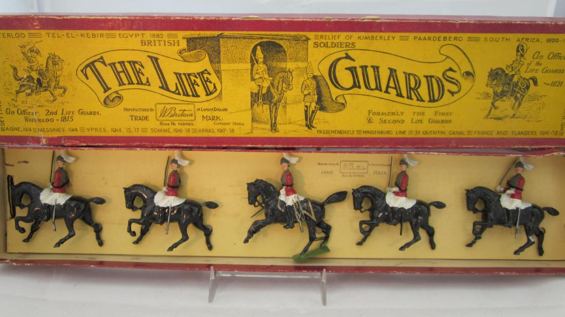 SoldBRITAINS SET 1 LIFE GUARDS5 pcs, minor paint wear to some horse legs, orig box & insert rough, C7-8.See Sold Price